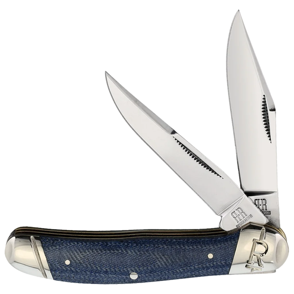 The Rough Ryder Denim Micarta T10 Carbon Copperhead features mirror polished T-10 carbon steel blades with match strike pulls and half stops. The handles are denim Micarta with nickel silver pins, brass liners, and nickel silver Slant "R" bolsters. It's 3.75" closed and it weighs 4oz.