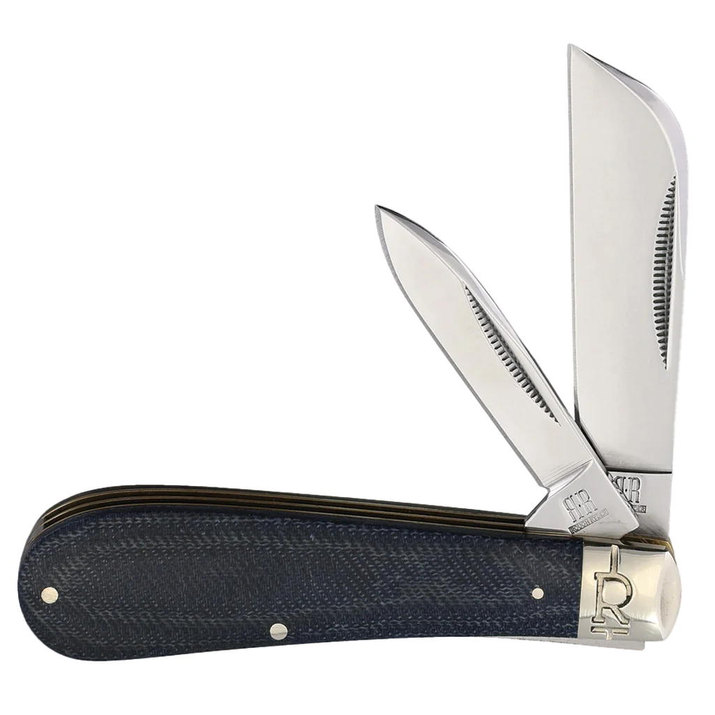 All the knives in the Rough Ryder Denim Micarta T10 Carbon Series feature mirror polished T-10 carbon steel blades with match strike pulls and half stops. The handles are denim micarta with brass liners and nickel sliver pins and slant 'R' bolsters. This Rough Ryder Denim Micarta T-10 Carbon Half Hawk features sheepsfoot and pen blades. It's 3.875" closed.