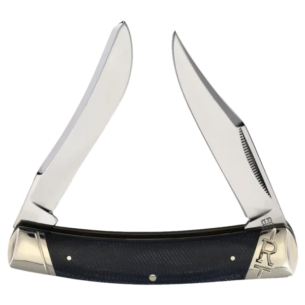All the knives in the Rough Ryder Denim Micarta T10 Carbon Series feature mirror polished T-10 carbon steel blades with match strike pulls and half stops. The handles are denim Micarta with brass liners and nickel sliver pins and slant 'R' bolsters. This Rough Ryder Denim Micarta T10 Carbon Large Moose features clip point and skinner blades. It's 4.37" closed and weighs 4oz.
