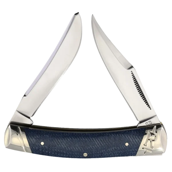 All the knives in the Rough Ryder Denim Micarta T10 Carbon Series feature mirror polished T-10 carbon steel blades with match strike pulls and half stops. The handles are denim Micarta with brass liners and nickel sliver pins and slant 'R' bolsters. This Rough Ryder Denim Micarta Small Moose folder features two 2.75" blades, one clip point, and one skinner, and has a closed length of 3.5".