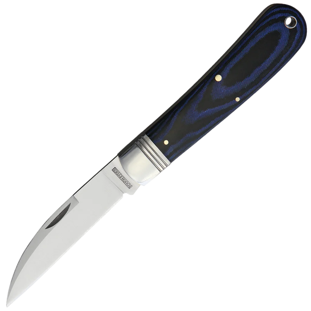 All the knives in the Rough Ryder Denim Micarta Series feature 440A stainless steel blades with nail nicks and a brushed satin finish. The handles are blue and black denim Micarta with brass liners and brushed stainless steel bolsters. This Rough Ryder Denim Micarta Work Knife has a 3.12" Wharncliffe blade. It's 3.87" closed and weighs 2.88oz.