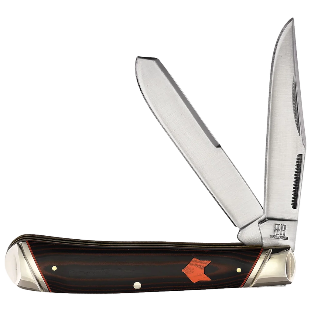 All of the knives in the Rough Ryder Desert Fox Series feature 440A stainless steel blades with nail nick pulls and a satin finish. The handles are black and orange micarta with brass pins and liners, ringed nickel silver bolsters, and an eye-catching Desert Fox Rough Ryder shield.