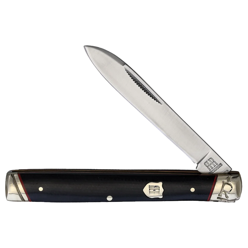 The Rough Ryder Highland Black Micarta Doctor’s Knife is a blend of timeless elegance and rugged functionality, perfect for those who value tradition in their everyday carry. Part of the Highland Black Micarta Series, this knife embodies the craftsmanship that Rough Ryder is known for, delivering a reliable tool that doesn’t sacrifice on style. The heart of the Doctor’s Knife is its 2.5-inch spear point blade, crafted from 440A stainless steel. Known for its excellent balance of edge retention, corrosion resistance, and ease of sharpening, 440A steel is a dependable choice for daily tasks. The blade features a satin finish that adds a touch of refinement, while the match strike pulls provide an easy, reliable way to open the knife. The handle of the Highland Black Micarta Doctor’s Knife is where this piece truly shines. Constructed from durable black micarta, the handle offers both a comfortable grip and a sleek appearance. The red underliners provide a subtle yet striking contrast, adding depth and character to the knife’s design. Brass liners add structural integrity, while nickel silver pins and bolsters enhance both the durability and the classic look of the knife. The handle is adorned with a nickel silver Rough Ryder badge shield, a mark of quality and tradition that signifies the knife’s heritage.