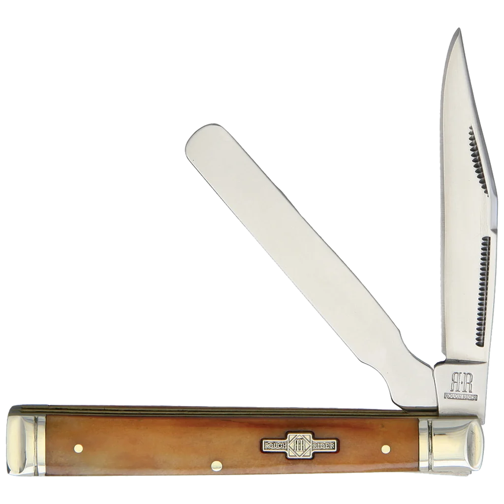 This folding pocket knife is 3.63" closed. It features a mirror polished 440A stainless steel clip point blade with half stops and match strike pulls, and a traditional doctors spatula. The handles are smooth tobacco bone with nickel silver spacers and bolsters, and brass liners.