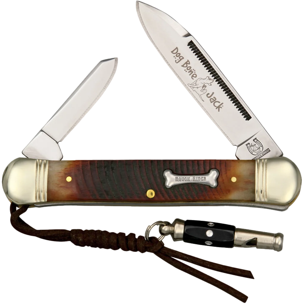 3 3/4" closed. Stainless spear and spey blades. Master blade etched Dog Bone Jack. Brown sawcut bone handles with grooved nickel silver bolsters and Dog Bone inlay shield. Leather lanyard with whistle. Black leather slip pouch with stainless pocket clip.