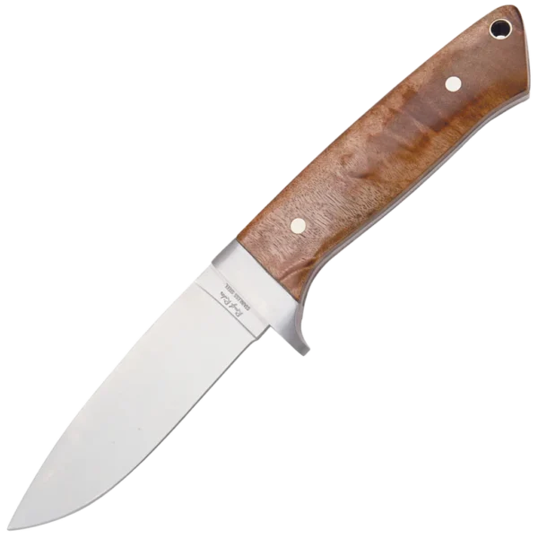 Rough Rider Drop Point Hunter – full tang construction. Light root wood handles with brushed stainless finger guard and lanyard hole. Made with stainless steel, it has a satin finish 3.5" drop point blade and an 8 1/4" overall length. Suitable for outdoor use, bushcraft and camping. Supplied with black nylon belt sheath.