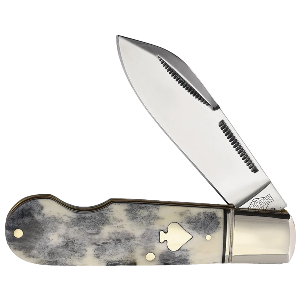 All the knives in Rough Ryder's new Black Appaloosa collection celebrate thirty years of Rough Ryder knives! Each features mirror-polished stainless steel blades with match strike pulls. The smooth bone handles are a nod to the traditional materials that have been used in knife-making for centuries, while the unique coloration sets this knife apart from the rest. The ringed nickel silver bolsters add a touch of sophistication, reinforcing the knife's structure and enhancing its visual appeal. A special feature of this anniversary edition is the spade-shaped nickel silver shield, which not only commemorates Rough Ryder's 30 years of excellence but also serves as a distinctive emblem of the brand's commitment to quality. The knife is further reinforced with brass liners and nickel silver pins, ensuring a sturdy and reliable construction that will stand the test of time. The EZ Open folding knife features a single non-locking 2.87" drop point blade and has a closed length of 3.63".