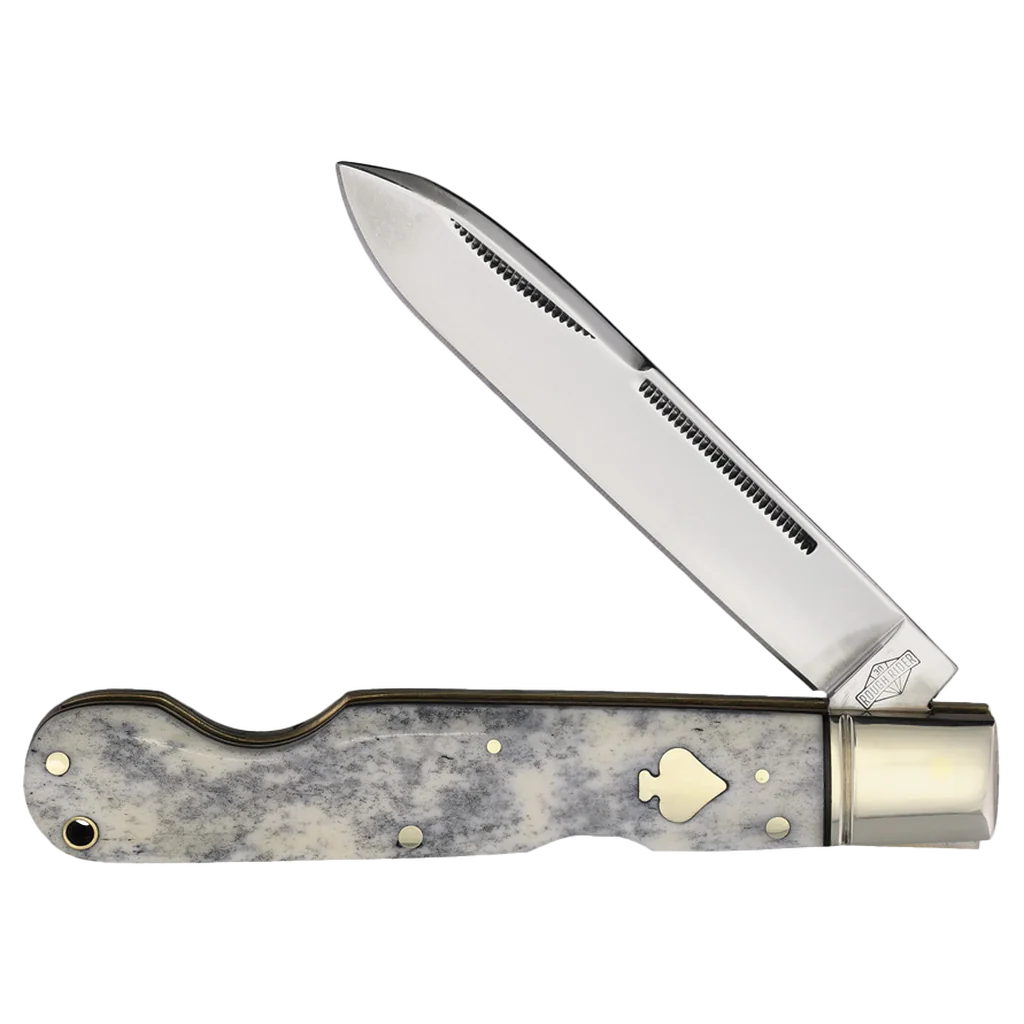 All the knives in Rough Ryder's new Black Appaloosa collection celebrate thirty years of Rough Ryder knives! Each features mirror-polished stainless steel blades with match strike pulls. The smooth bone handles are a nod to the traditional materials that have been used in knife-making for centuries, while the unique coloration sets this knife apart from the rest. The ringed nickel silver bolsters add a touch of sophistication, reinforcing the knife's structure and enhancing its visual appeal. A special feature of this anniversary edition is the spade-shaped nickel silver shield, which not only commemorates Rough Ryder's 30 years of excellence but also serves as a distinctive emblem of the brand's commitment to quality. The knife is further reinforced with brass liners and nickel silver pins, ensuring a sturdy and reliable construction that will stand the test of time.