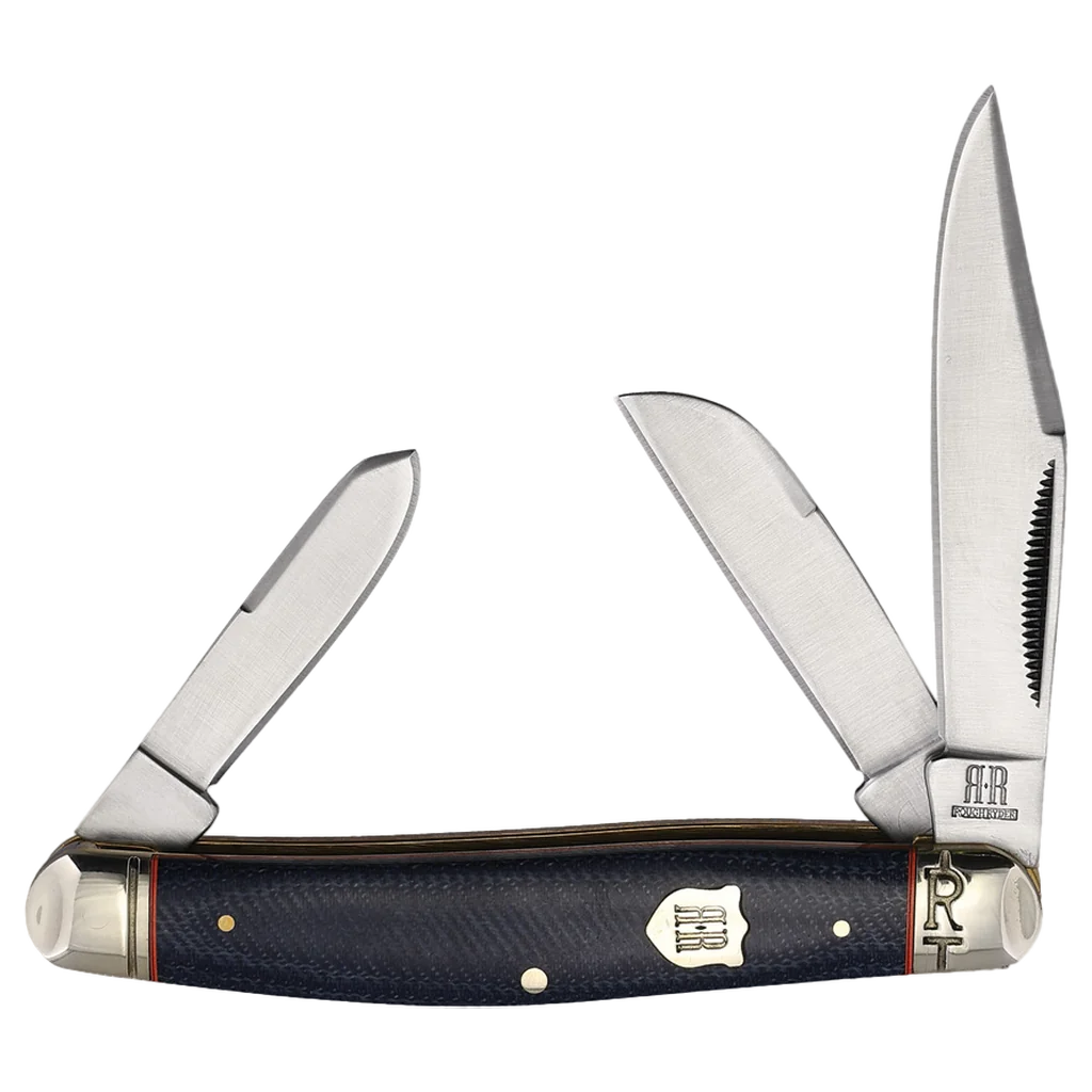 The Rough Ryder Faded Blue Jeans Bar J Stockman features 440A stainless steel clip point, Sheepsfoot, and spey blades with match strike pulls and a satin finish. The handles are denim Micarta with brass liners, orange underliners, nickel silver pins and bolsters, and a round nickel silver shield. It's 4" closed and weighs 1.92oz.