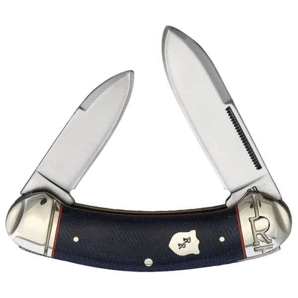 All the knives in the Rough Ryder Faded Blue Jeans Series feature 440A stainless steel blades with nail nick pulls and a smooth satin finish. The handles are Faded Denim blue Micarta with nickel silver pins, orange underliners, embossed nickel silver bolsters, and a nickel silver badge-shaped Rough Ryder shield. This Rough Ryder Bow Canoe has a 2.25" spear point and 1.75" pen blade. It's 3.5" closed and weighs 3.5oz.