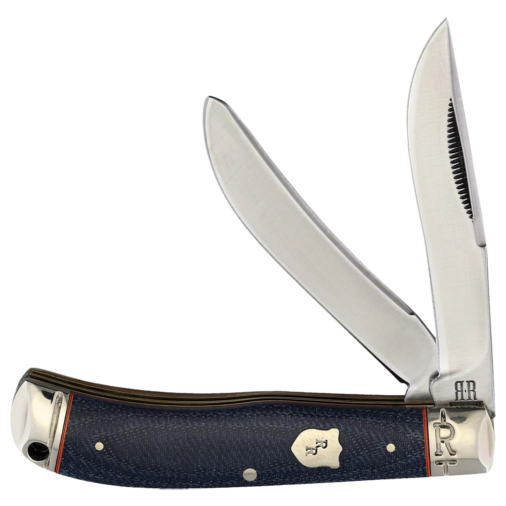 All the knives in the Rough Ryder Faded Blue Jeans Series feature 440A stainless steel blades with nail nick pulls and a smooth satin finish. The handles are Faded Denim blue Micarta with nickel silver pins, orange underliners, embossed nickel silver bolsters, and a nickel silver badge-shaped Rough Ryder shield. This Rough Ryder Faded Blue Jeans Mini Skinner Trapper has clip point and spey blades. It’s 3.5" closed and weighs 2.7oz.