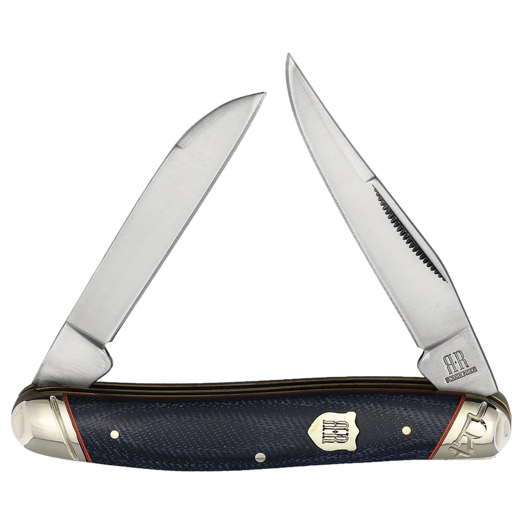 All the knives in the Rough Ryder Faded Blue Jeans Series feature 440A stainless steel blades with nail nick pulls and a smooth satin finish. The handles are Faded Denim blue Micarta with nickel silver pins, orange underliners, embossed nickel silver bolsters, and a nickel silver badge-shaped Rough Ryder shield. The Rough Ryder Muskrat seamlessly combines tradition with modern craftsmanship. This slip joint knife features two clip point blades, allowing users to alternate use and maintain sharpness during everyday tasks. The Muskrat fits comfortably in the hand, enhancing its utility and ease of use.