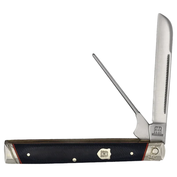 All the knives in the Rough Ryder Faded Blue Jeans Series feature 440A stainless steel blades with nail nick pulls and a smooth satin finish. The handles are Faded Denim blue Micarta with nickel silver pins, orange underliners, embossed nickel silver bolsters, and a nickel silver badge-shaped Rough Ryder shield. This Faded Blue Jeans Pipe Doctor has a 3" Sheepsfoot blade and a pipe cleaner. It’s 3.75" closed and weighs 4oz.