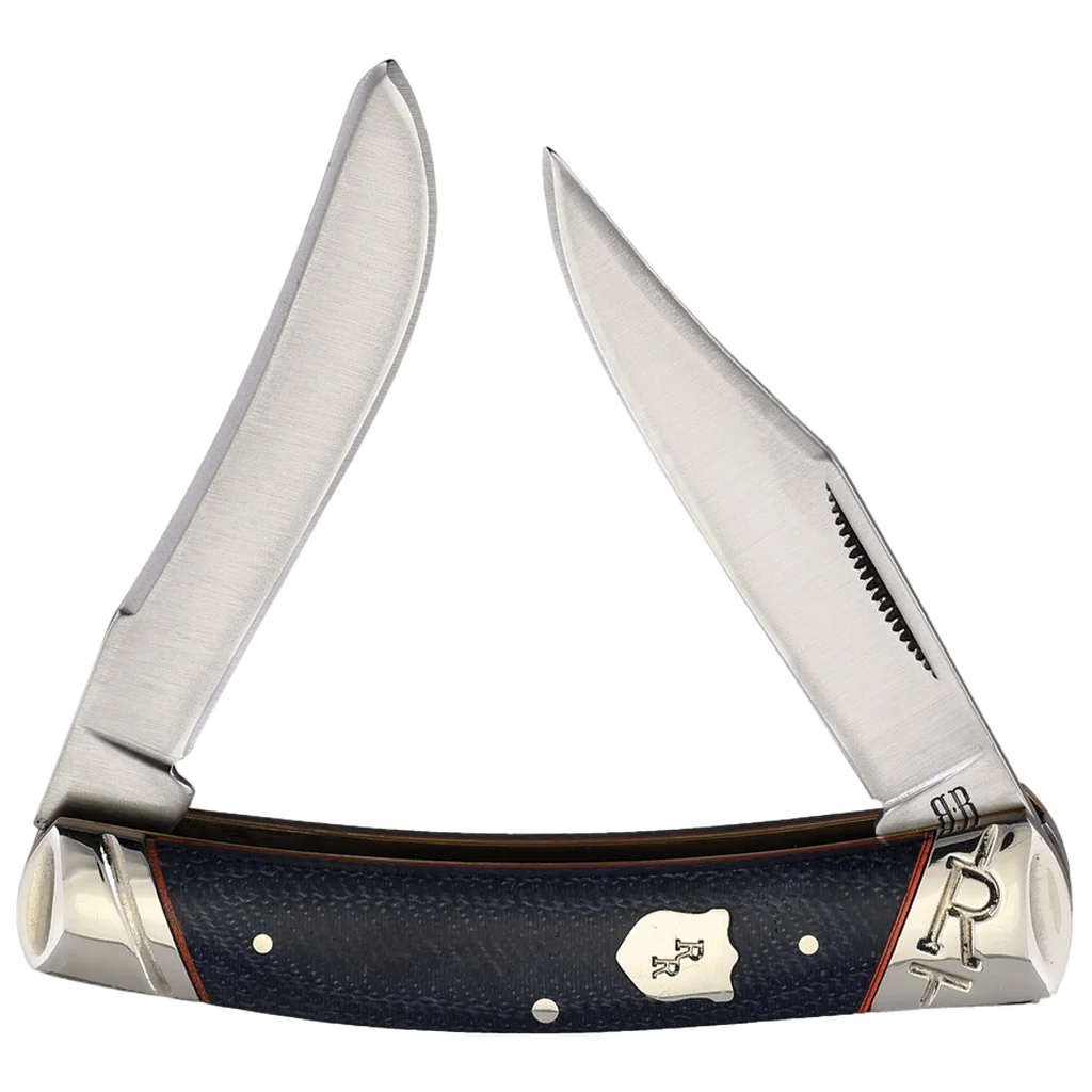 All the knives in the Rough Ryder Faded Blue Jeans Series feature 440A stainless steel blades with nail nick pulls and a smooth satin finish. The handles are Faded Denim blue Micarta with nickel silver pins, orange underliners, embossed nickel silver bolsters, and a nickel silver badge-shaped Rough Ryder shield. This Rough Ryder Faded Blue Jeans Small Moose has 2.75" clip point and skinner blades. It's 3.5" closed and weighs 2.24oz.