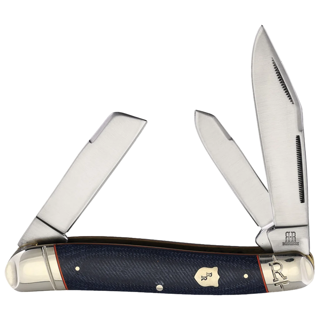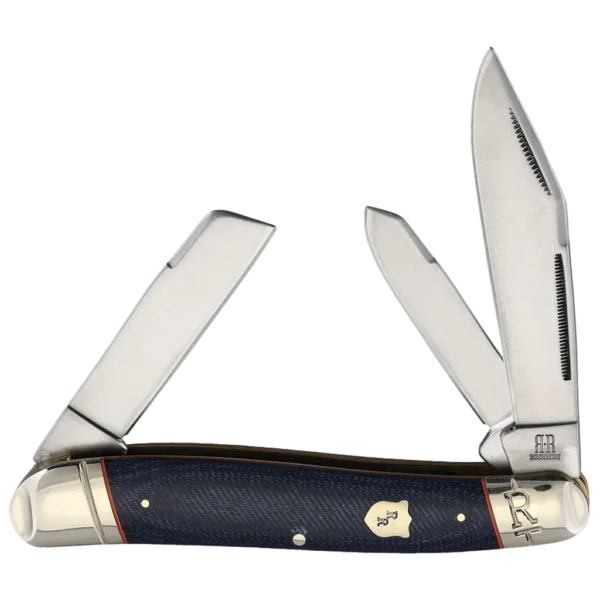 All the knives in the Rough Ryder Faded Blue Jeans Series feature 440A stainless steel blades with nail nick pulls and a smooth satin finish. The handles are Faded Denim blue Micarta with nickel silver pins, orange underliners, embossed nickel silver bolsters, and a nickel silver badge-shaped Rough Ryder shield. This Texas Stockman features clip point, Sheepsfoot, and spey blades. It's 4.75" closed and weighs 5.47oz.