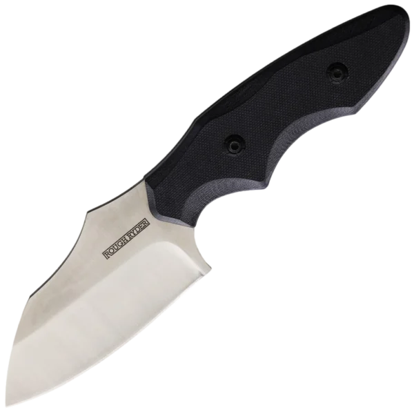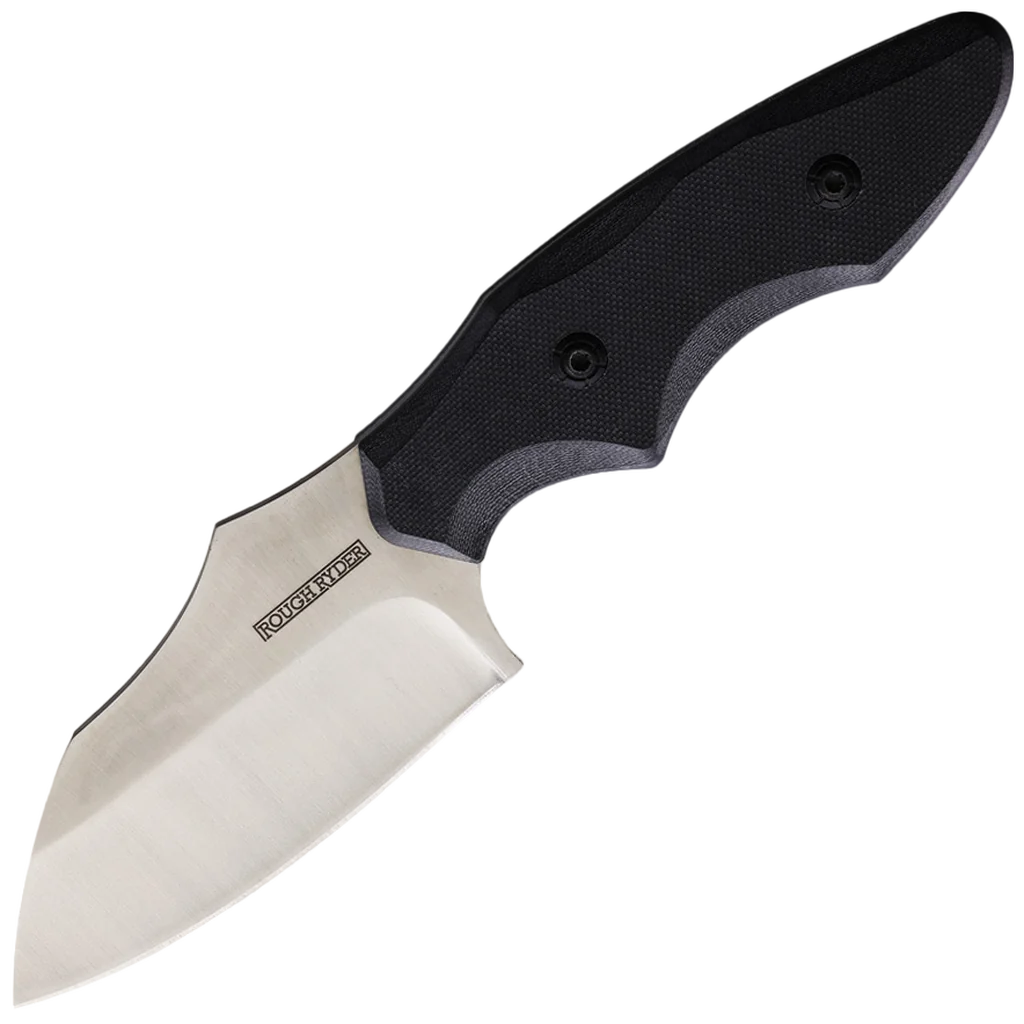 The Rough Ryder Black G-10 Fixed Blade features a 3.5" 440A stainless steel cleaver with a satin finish. This full tang fixed blade has a black G-10 handle with black coated stainless steel hardware. It's 8" overall and weighs 12oz. Includes a black nylon sheath with leg ties.