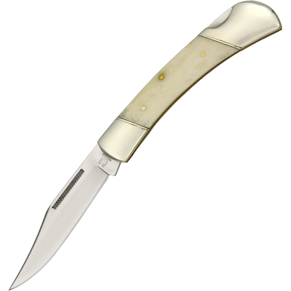 The Rough Ryder White Smooth Bone Large Lockback features a 3.75" mirror polished 440A stainless steel clip point blade with a nail nick pull. This lockback has white smooth bone handles with brass pins, brass liners, and nickel silver bolsters. It's 5" closed and weighs 6.4oz.