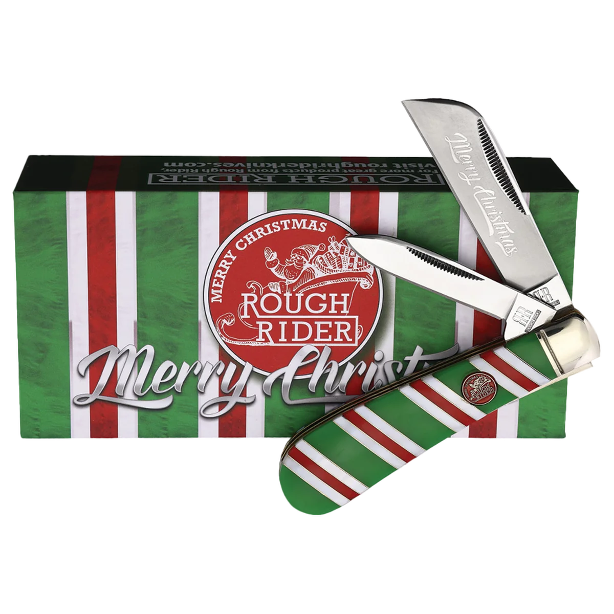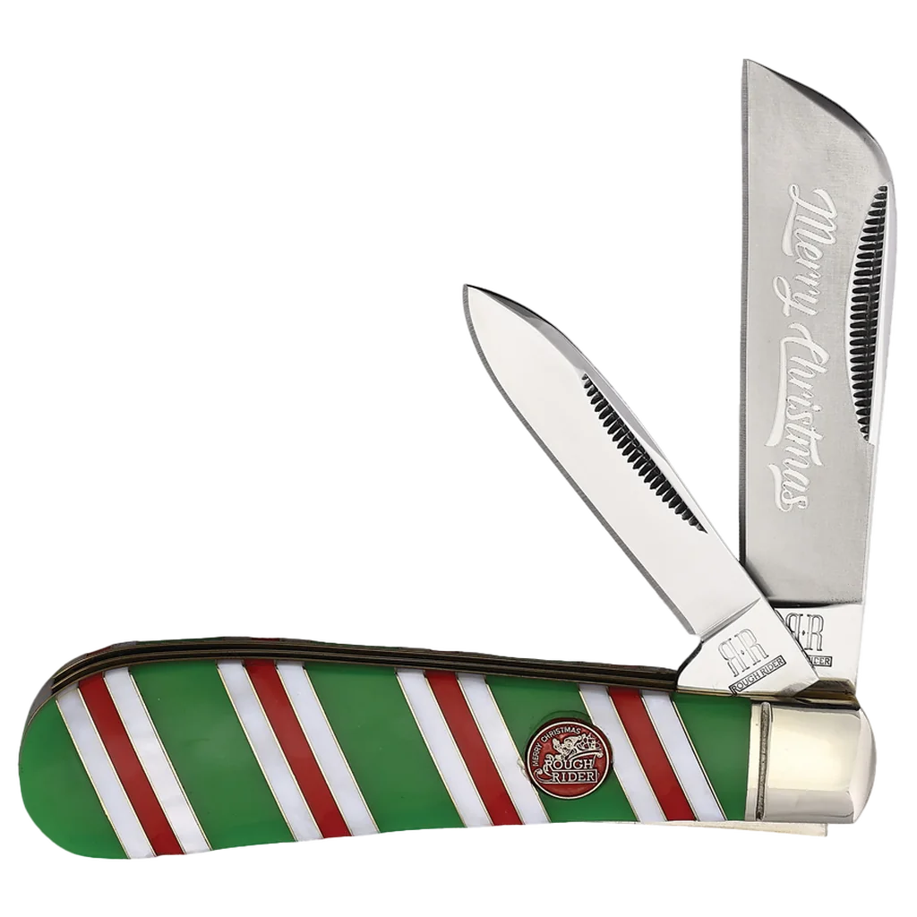 The Rough Ryder Christmas 2023 Half Hawk (30th Anniversary Edition) features 440A stainless steel Sheepsfoot and pen blades with match strike pulls and a festive "Merry Christmas" frosted blade etch. The handles are candy cane striped Mother-of-Pearl and green synthetic with nickel silver spacers and bolsters, brass liners, and a special color-filled Merry Christmas shield. It's 4" closed and weighs 3.56oz.