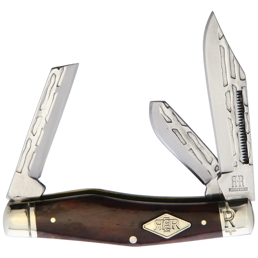 The Rough Ryder Heavy Forge Stockman features T10 high carbon alloy steel clip point, sheepsfoot, and spey blades with match strike pulls and a forge-like finish. The handles are brown smooth bone with brass liners, nickel silver pins and bolsters, and an RR Classic Carbon shield. It's 3.5" closed and weighs 2.56oz.