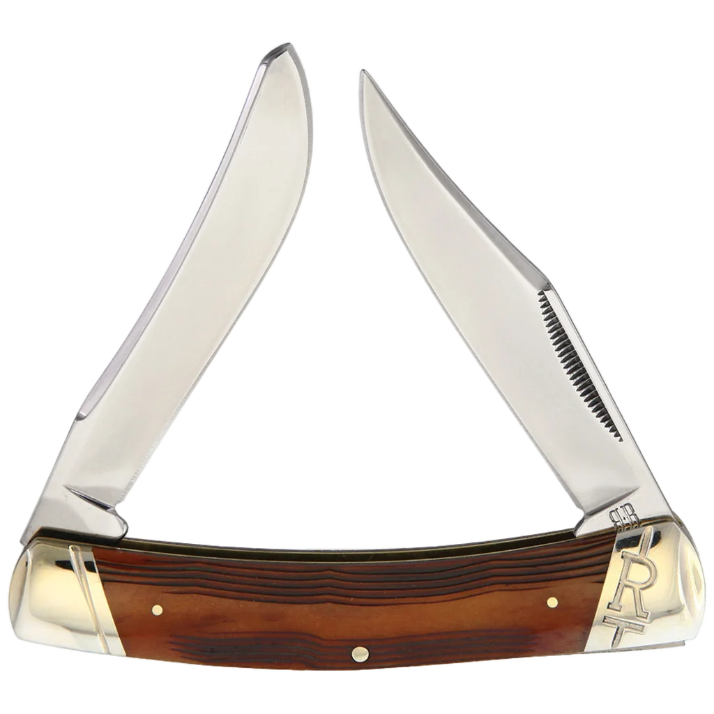 All the knives in the Rough Ryder High Plains Series feature mirror polished 440A stainless steel blades with half stops and match strike pulls. The handles are brown bone with brass liners and embossed nickel silver bolsters. This Rough Ryder High Plains Moose has 3.37" clip point and skinner blades. It's 4.37" closed and weighs 3.67oz.