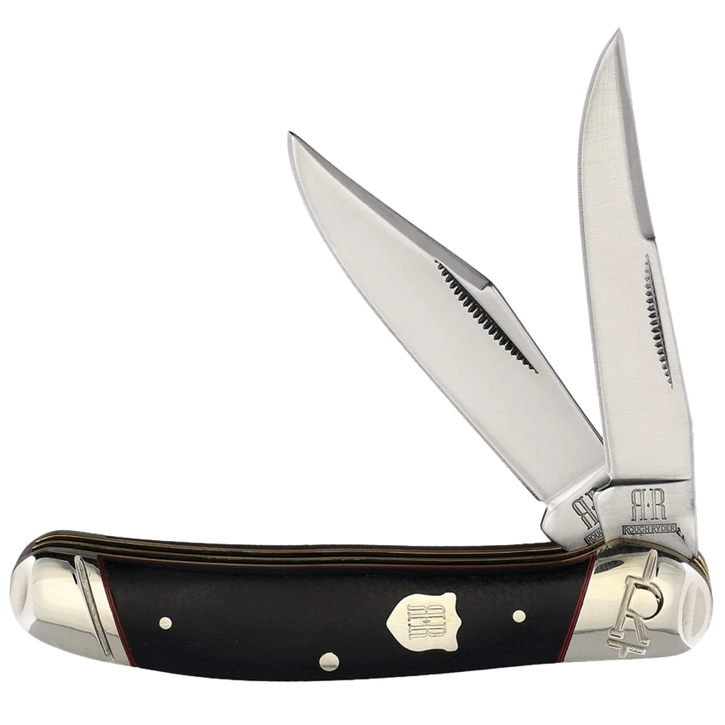 The Rough Ryder Highland Black Micarta Series Copperhead features 2.62" 440A stainless steel clip point and skinner blades with match strike pulls and a satin finish. The handles are black micarta with red underliners, brass liners, nickel silver pins and bolsters, and a nickel silver Rough Ryder badge shield. It's 3.75" closed and weighs 3.04oz.