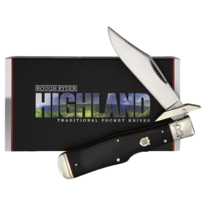 Part of the Rough Ryder Highland Black Micarta series, this knife is built with the same attention to detail and quality that has made Rough Ryder a trusted name among knife enthusiasts. It’s not just a tool; it’s a reliable companion that’s ready to tackle any task you throw at it. At the core of this knife is the 440A stainless steel blade, meticulously crafted to deliver superior sharpness and durability. The micarta handle’s sleek black appearance is complemented by nickel silver pins and bolsters, adding a touch of sophistication to the overall design. Brass liners and red underliners provide a subtle contrast, enhancing both the aesthetics and structural integrity of the knife. This Rough Ryder Highland Black Micarta Large Swing Guard features a 4" clip point blade, a swing guard, and a sturdy back lock. It's 5.38" closed.