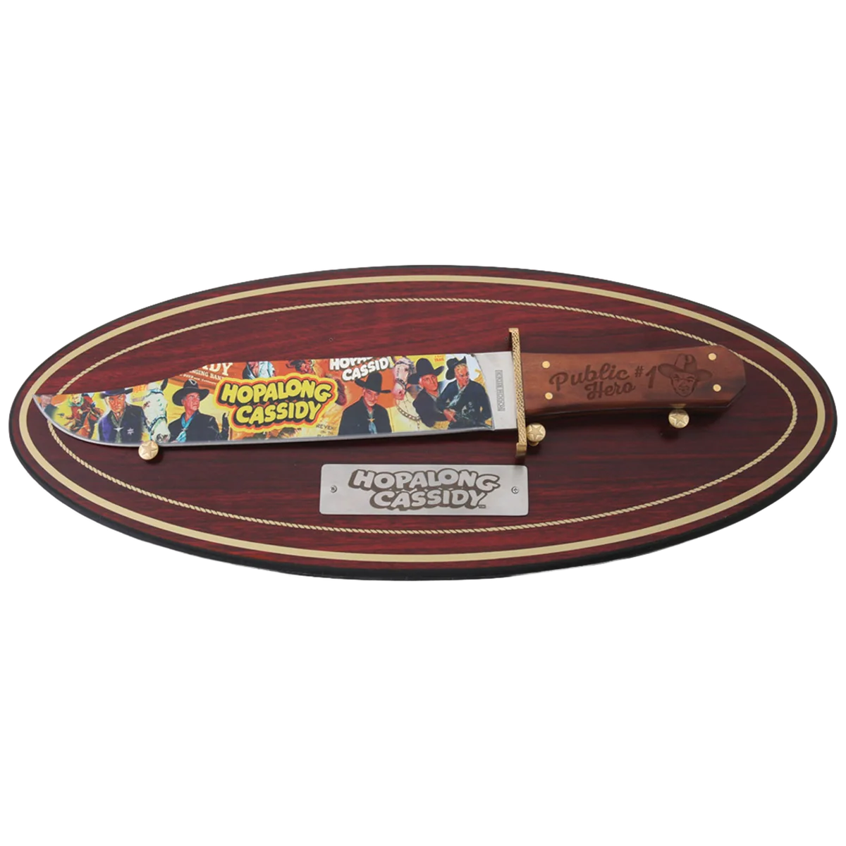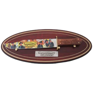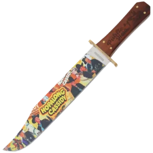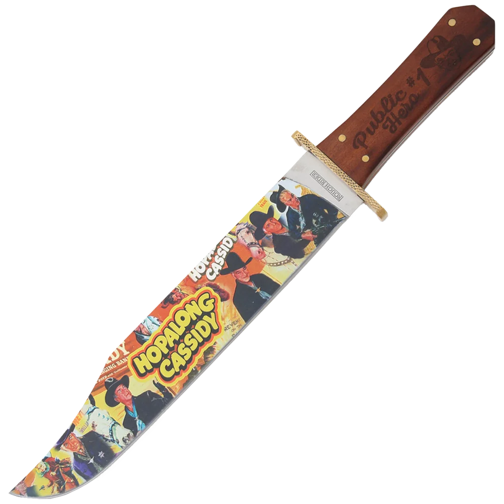The Rough Ryder Hopalong Cassidy Public Hero #1 Bowie features a 11.5" 440A stainless steel clip point blade with a full-color art inlay blade finish. This full tang fixed blade has a hardwood handle with front embellishment, multiple brass rivets, decorative guard, display plaque, and hanging hardware included. It's 16.62" overall and weighs 7.2oz. Includes a black nylon belt sheath.