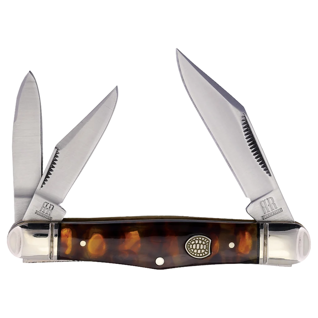 Gear up for timeless craftsmanship with the Rough Ryder Imitation Tortoise Medium Whittler – a knife that combines classic charm with modern utility. Crafted for those who appreciate quality and style, this Medium Whittler boasts stainless steel blades with match strike pulls and a satin finish, ready to tackle any whittling project with ease. But it's not just about the blades – the synthetic tortoise shell handles, adorned with brass liners, nickel silver pins, and ringed nickel silver bolsters, exude sophistication. Complete with a special tortoise shell shield, it's a testament to attention to detail. Whether you're a seasoned whittler or just discovering the joy of carving, the Rough Ryder Imitation Tortoise Medium Whittler is your perfect companion. With its versatile blades and handsome design, it's sure to become a staple in your collection.