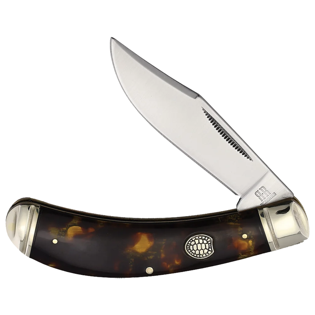 All the knives in the Rough Ryder Tortoise Shell Series feature 440B stainless steel blades with match strike pulls and a satin finish. The handles are beautifully-crafted imitation tortoise shell with brass liners, nickel silver pins and bolsters, and a special nickel silver tortoise shell shield. This Rough Ryder Tortoise Shell Bow Trapper has a clip point blade. It's 4" closed and weighs 4oz.