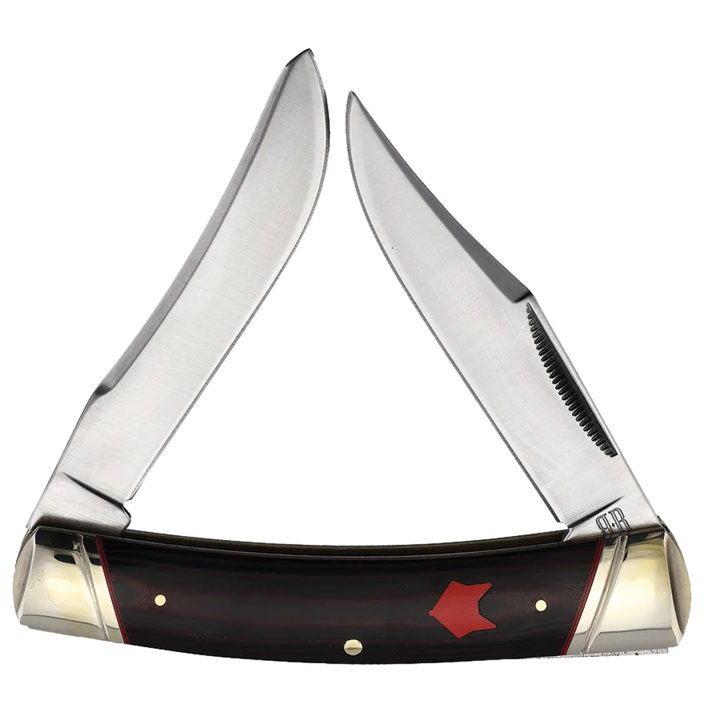 The Rough Ryder Red Fox Large Moose Pocket Knife is a must-have for any pocket knife enthusiast. This EDC pocket knife features 3.37" mirror-polished 440 stainless steel clip point and spey blades with plain edges. They open with ambidextrous match strike pulls. The black Micarta handle has nickel silver pins and bolsters, brass liners, and red synthetic spacers. It also features a Red Fox Micarta shield.