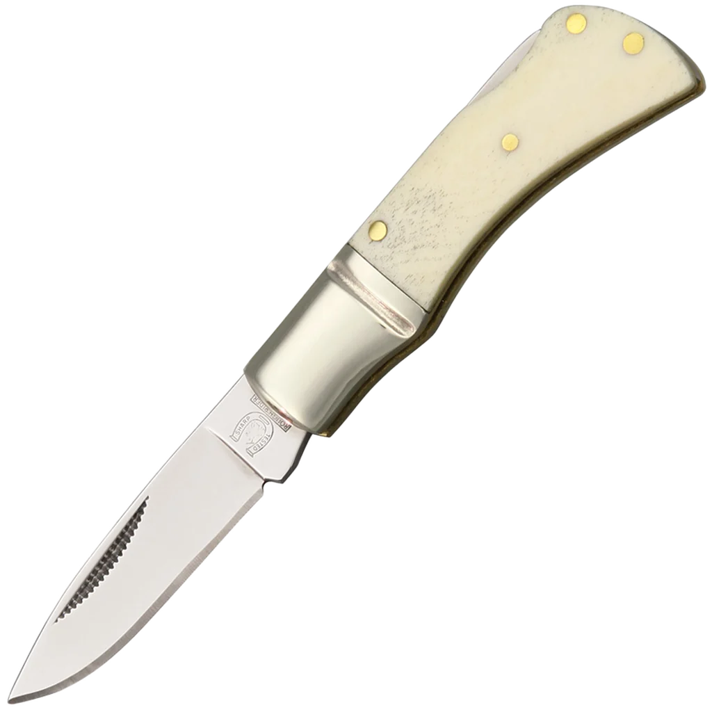 The Rough Ryder Little Mustang is a traditional lockback pocket knife for everyday carry. The 440A stainless steel, drop point blade has a mirror finish and nail nick opener. The handle is made of smooth white bone with a nickel silver bolster.