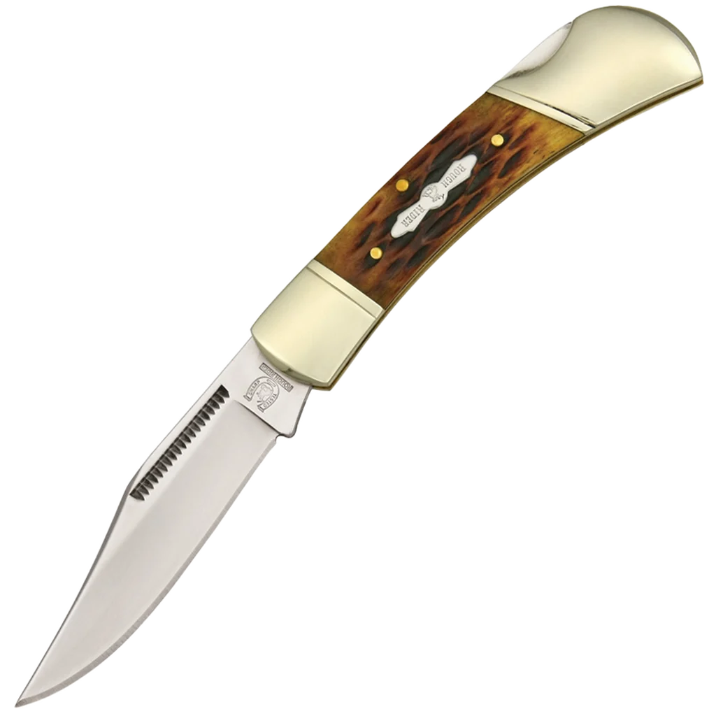 Rough Ryder lockback in an amber jigged bone handle. Made with 440 stainless steel it has a 2.75″ polished clip point blade with a closed length of 3.75″ and a 6.75″ overall length. It has nickel silver bolsters and an inlay shield.
