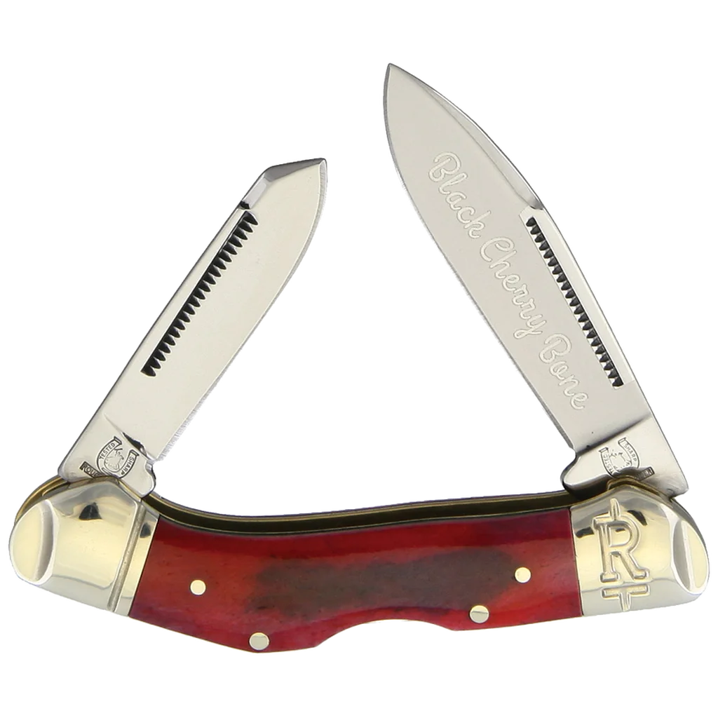 The Rough Rider Mini Canoe is a traditional lockback pocket knife. The 440A stainless steel, spear point and spey, blades have mirror finishes with frost etching and nail nick openers. The handle is made of black cherry smooth bone with nickel silver bolsters.