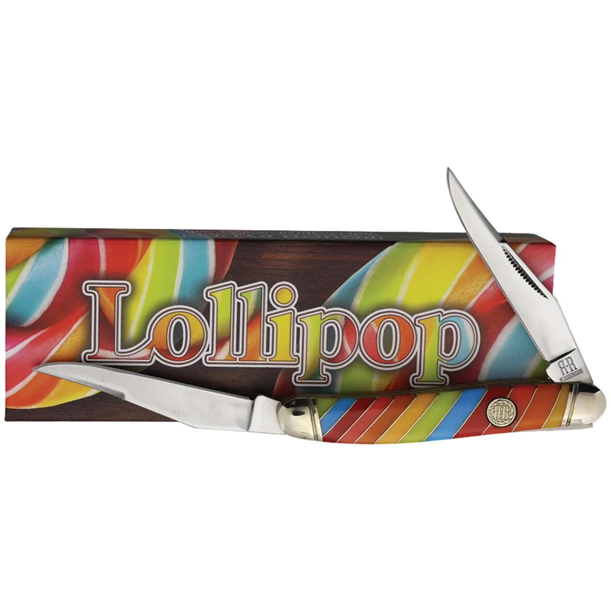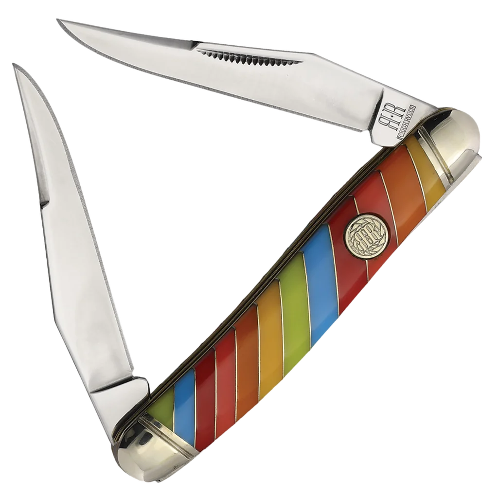 All of the knives in the Rough Ryder Lollipop Series feature mirror polished stainless steel blades with nail nick pulls. The handles are a vibrant multicolored striped synthetic material with nickel silver spacers and bolsters, brass liners, and a nickel silver Rough Ryder shield. Lollipop Series. 3.5" (8.89cm) closed. Mirror finish stainless dual clip blade. Multi plastic handle. Nickel silver bolster(s). Inlay shield. Boxed.