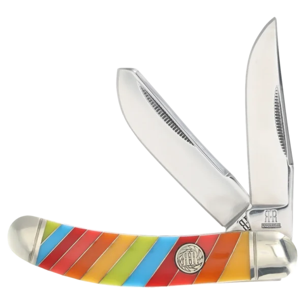 All of the knives in the Rough Ryder Lollipop Series feature mirror polished stainless steel blades with nail nick pulls. The handles are a vibrant multicolored striped synthetic material with nickel silver spacers and bolsters, brass liners, and a nickel silver Rough Ryder shield. 3.75" (9.53cm) closed. Mirror finish stainless clip and spey blades. Multi plastic handle. Nickel silver bolster(s). Inlay shield. Boxed.