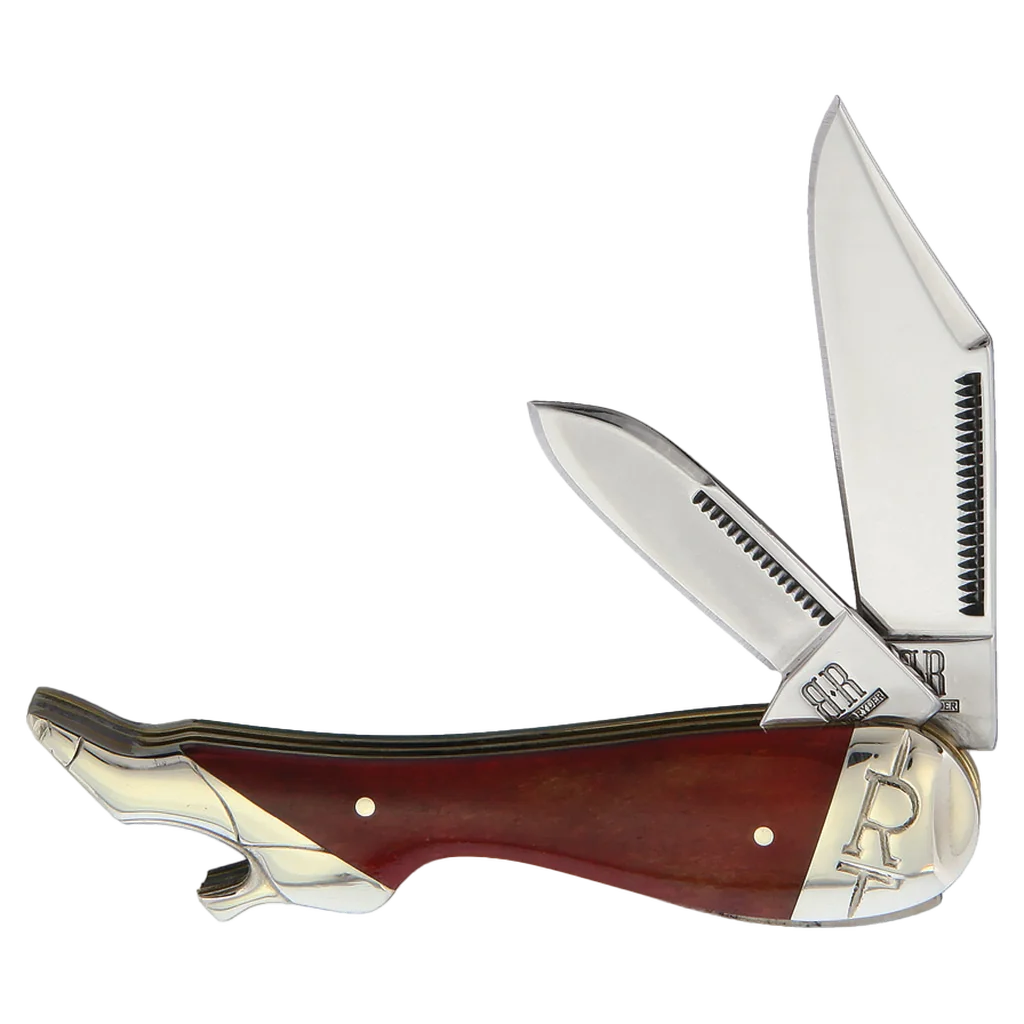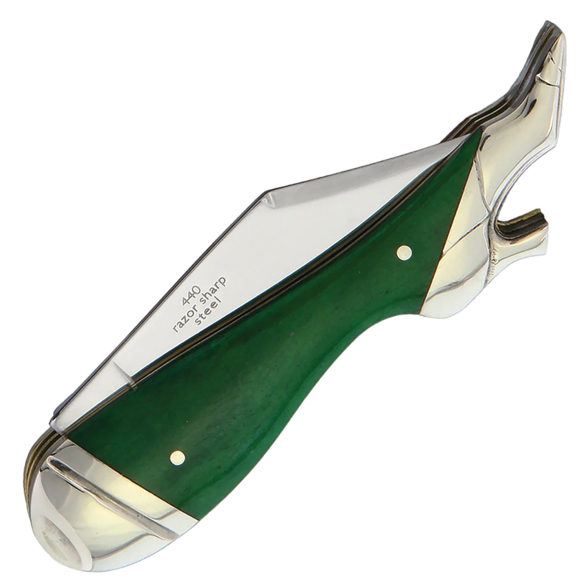 3.25" closed. Mirror finish stainless clip and pen blades. Smooth bone handle. Nickel silver bolsters. Magician's knives have different handle colors on each side of the knife. Red handle on one side and green on the other. Boxed.