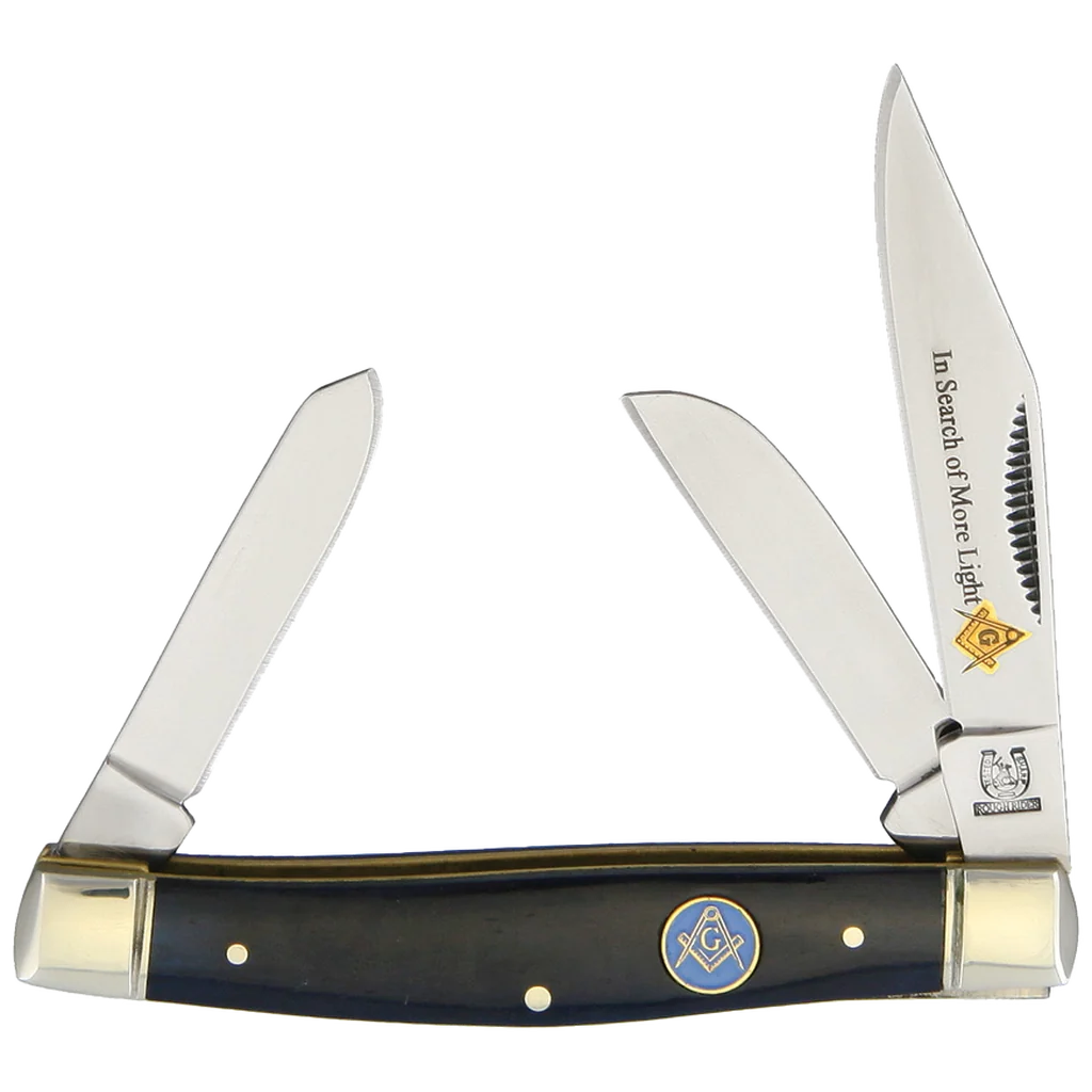 The Masonic Stockman by Rough Rider is a wonderful knife for everyday carry. The blue bone, stockman style handle houses a clip point, pen, and sheep’s foot blades, which are made of 440A Stainless Steel. It has “In Search of More Light” along with a golden Masonic emblem beautifully etched on the clip point blade, as well as a blue filled color brass shield dawning the Masonic emblem on the handle. Like most traditional pocket knives, it includes a slip joint locking style. This knife includes a thumbnail groove on the clip point blade for easy opening. This pocket knife offers a beautiful, sleek design, while also being small enough to fit in your pocket and hand comfortably. Pick one up for your own collection or as a gift any knife collector in your life!