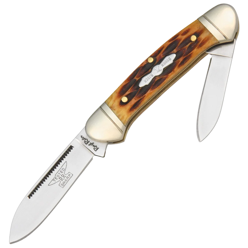 The Rough Ryder Amber Jigged Bone Mini Canoe Knife features mirror-polished 1.5" spear point and 1.12" pen 440A stainless steel blades with nail nick pulls. The handles are amber jigged bone with brass pins and liners and nickel silver bolsters and shield. It’s 2" closed.