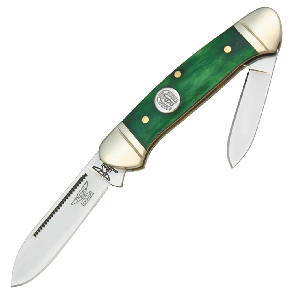 The Rough Ryder Green Smooth Bone Mini Canoe features mirror polished 440A stainless steel 2" spear point and 1.5" pen blades with half stops and nail nick pulls. The handles are green smooth bone with brass pins and liners, as well as ringed nickel silver bolsters. It’s 2.75" closed and weighs 1.6 oz.