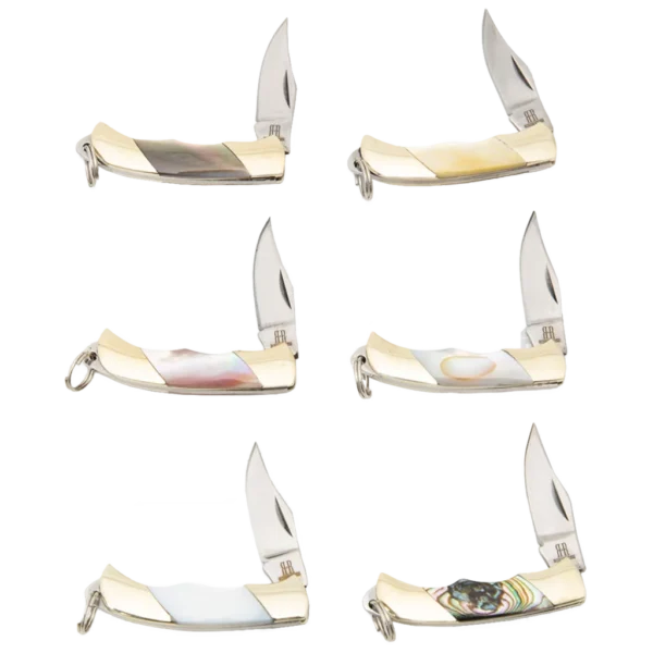 Introducing the Rough Ryder Mini Folder Collector set, a meticulously crafted collection of six exquisite pocket knives designed for both enthusiasts and collectors. Each knife in this set features a 1.12" clip point blade made from mirror-polished 440A stainless steel, ensuring sharpness, durability, and corrosion resistance. These blades are perfect for small tasks and offer reliable performance for everyday use. The standout feature of these mini folders is their stunning Mother-of-Pearl handles. Each handle showcases the natural beauty of Mother-of-Pearl, providing a unique and elegant appearance that is both eye-catching and timeless. Complementing the handles are brass liners that add strength and structural integrity, while nickel silver bolsters offer a touch of classic sophistication. The set comes complete with a velvet-lined collector's display box, providing a luxurious and protective storage solution. This display box not only keeps your knives safe but also allows you to showcase them proudly, making it an excellent addition to any collection.