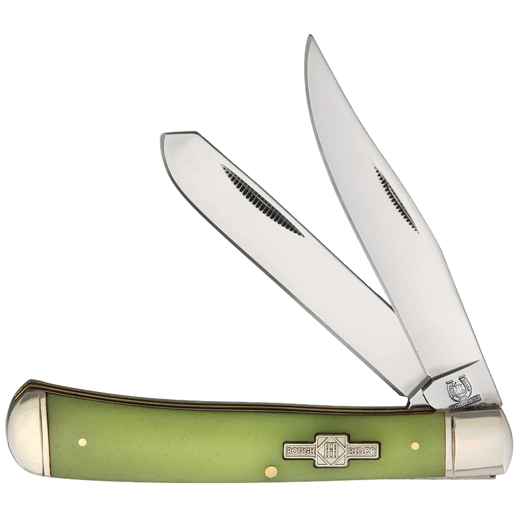 All of the knives in the Rough Ryder Moon Glow Series feature mirror polished 440A stainless steel blades with nail nick pulls. The handles are constructed from smooth glow-in-the-dark resin, finished with with brass liners, nickel silver pins, and ringed nickel silver bolsters. The Moon Glow Trapper has a 3.27" clip point and 3.25" spey blade. It's 4.12" closed and weighs 4oz.