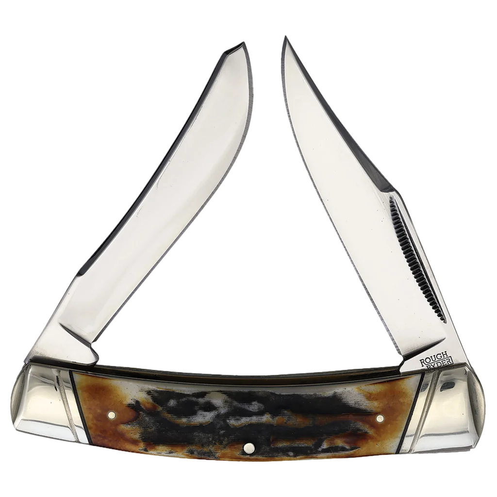 All the knives in the Rough Ryder Classic Cinnamon Bone Stag Series feature mirror polished carbon steel blades with match strike pulls and half stops. The handles are cinnamon bone stag with brass and black synthetic liners, nickel silver pins, and nickel silver bolsters. This Rough Ryder Classic Cinnamon Bone Stag Moose features 3" upswept and clip point blades. It's 4.25" closed and weighs 4.41oz.