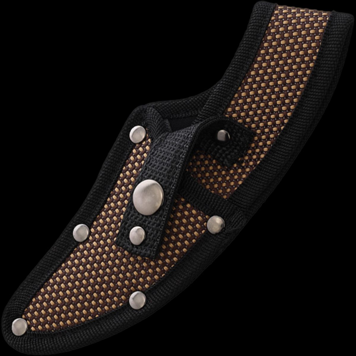 The Rough Ryder Mosaic Pakkawood Fixed Blade Knife is a masterful blend of rugged performance and refined craftsmanship, making it a reliable companion for both outdoor adventures and everyday tasks. This knife is designed with a keen eye for detail, delivering not only in functionality but also in aesthetics, appealing to those who value both form and function in their gear. The knife features a 3.5-inch stainless steel Wharncliffe blade with a satin finish, providing a sharp, precise edge that’s ideal for a variety of cutting tasks. The Wharncliffe blade design, known for its straight cutting edge and pointed tip, offers exceptional control, making it a versatile tool for everything from slicing to intricate work. The full tang construction ensures that this knife is robust and durable, capable of handling tough jobs without compromising on performance. The handle of the Rough Ryder Mosaic Pakkawood Fixed Blade Knife is as striking as it is functional. Crafted from swirled brown Pakkawood, the handle offers a unique and natural appearance that’s both eye-catching and comfortable to hold. Pakkawood, a composite material made from layers of wood and resin, is known for its durability and resistance to moisture, making it an excellent choice for outdoor use. The handle is further enhanced with decorative mosaic pins, adding a touch of elegance and individuality to each knife. A lanyard hole, complete with a leather lanyard, provides additional carrying options and ensures that your knife is always within reach. It comes with a brown nylon sheath that features a belt clip, allowing for secure and convenient carry .