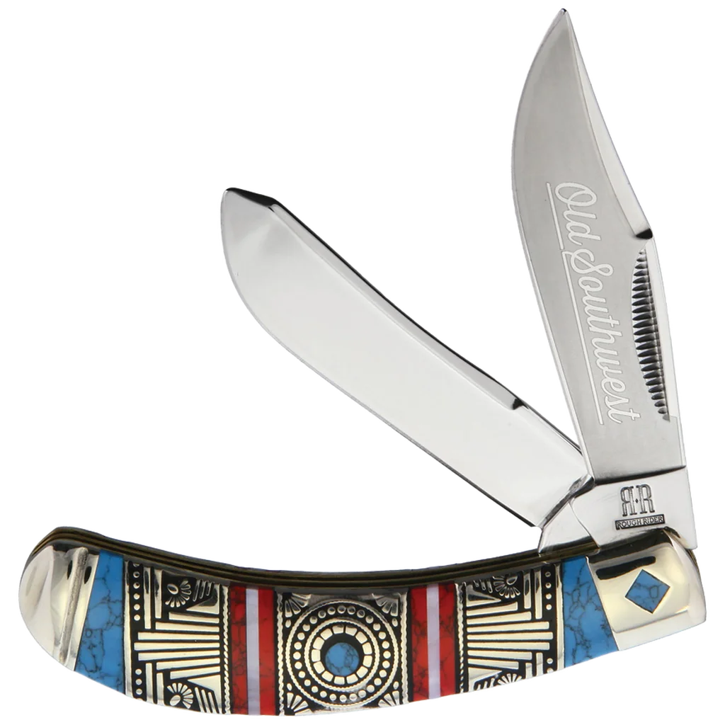 All of the knives in the Rough Ryder Old Southwest Series feature mirror polished 440A stainless steel blades with a reverse frosted "Old Southwest" blade embellishment, slip joints, and nail nick pulls. The handles are grooved nickel silver with a genuine pearl inlay, cracked synthetic turquoise and jasper spacers, and grooved nickel silver bolsters with a cracked synthetic turquoise inlay. The Old Southwest Bow Trapper features clip point and spey blades measuring 3.25" and 3.27" in length. It's 4.12" closed and weighs 4oz.