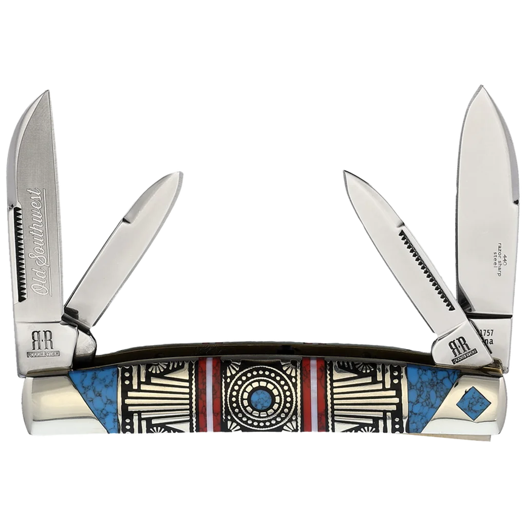 All of the knives in the Rough Ryder Old Southwest Series feature mirror polished 440A stainless steel blades with a reverse frosted "Old Southwest" blade embellishment, slip joints, and nail nick pulls. The handles are grooved nickel silver with a genuine pearl inlay, cracked synthetic turquoise and jasper spacers, and grooved nickel silver bolsters with a cracked synthetic turquoise inlay. This Rough Ryder Old Southwest Congress features Sheepsfoot, spey, and pen blades. It's 3.75" closed and weighs 3.81oz.