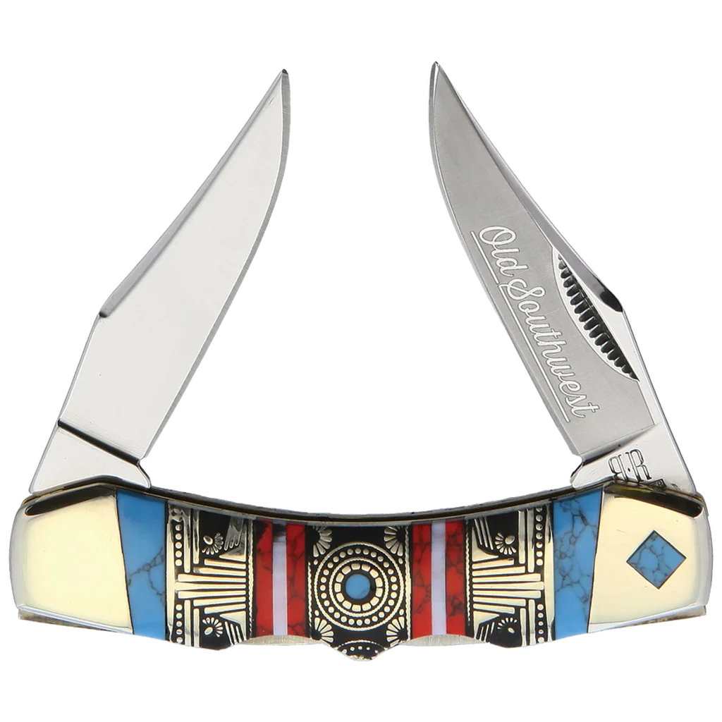 The Double Lockback is a traditional slip joint pocket knife. It's made of 440A stainless steel and features ambidextrous nickel silver bolsters, liners and end cap. It has an old southwest style handle with turquoise inlays. The Double Lockback features two 2.12" Clip Point blades and a closed length of 4".