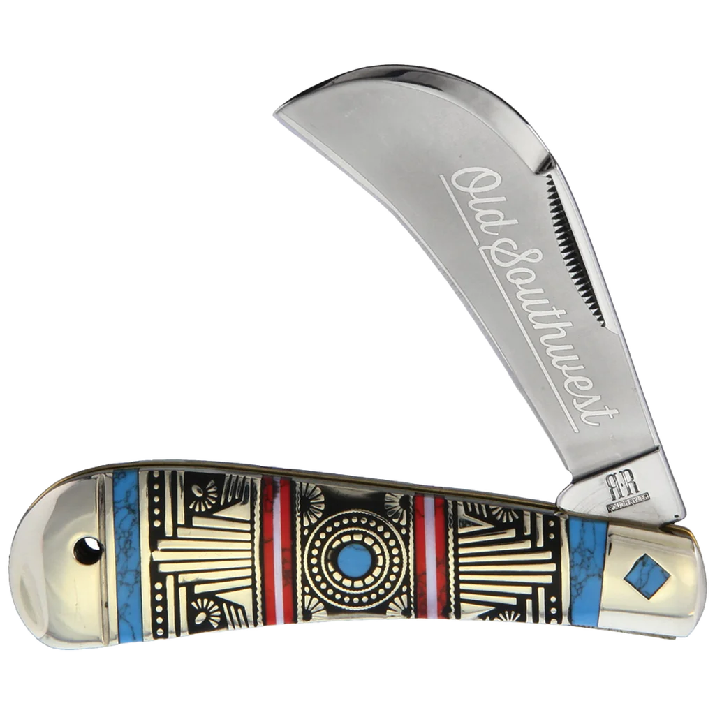 All of the knives in the Rough Ryder Old Southwest Series feature mirror polished 440A stainless steel blades with a reverse frosted "Old Southwest" blade embellishment, slip joints, and nail nick pulls. The handles are grooved nickel silver with a genuine pearl inlay, cracked synthetic turquoise and jasper spacers, and grooved nickel silver bolsters with a cracked synthetic turquoise inlay. This Old Southwest Hawkbill features a 3" Hawkbill blade. It's 4" closed and weighs 2.75oz.
