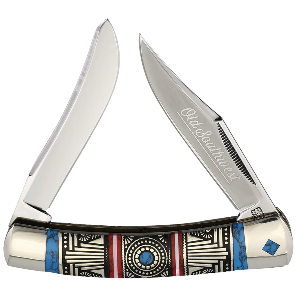 All of the knives in the Rough Ryder Old Southwest Series feature mirror polished 440A stainless steel blades with a reverse frosted "Old Southwest" blade embellishment, slip joints, and nail nick pulls. The handles are grooved nickel silver with a genuine pearl inlay, cracked synthetic turquoise and jasper spacers, and grooved nickel silver bolsters with a cracked synthetic turquoise inlay. The Old Southwest Large Moose features 3.37" clip point and spey blades. It's 4.37" closed.
