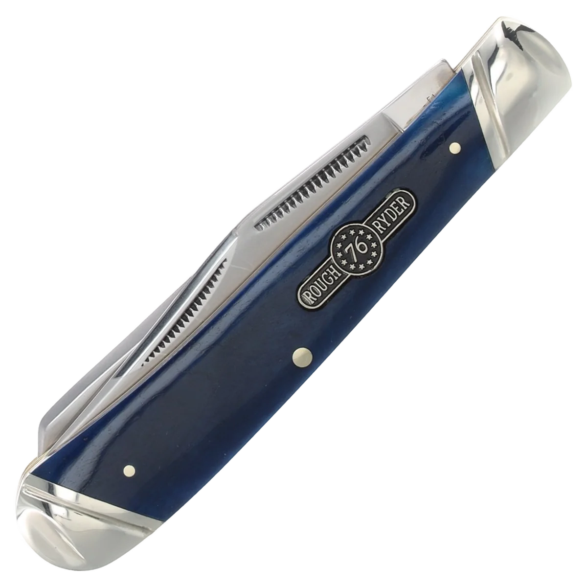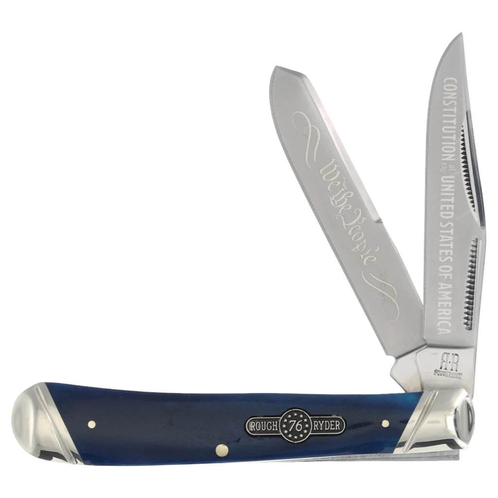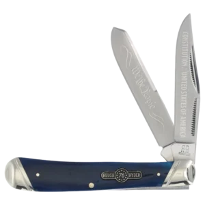 The Rough Ryder Patriot Series Trapper Folding Knife Gift Set with Collector's Coin is more than just a knife; it’s a tribute to American heritage, skillfully crafted for those who value both quality and tradition. This special edition set is a perfect choice for collectors, knife enthusiasts, and anyone who appreciates a finely made blade. Featuring a beautifully designed trapper knife and a commemorative coin, this set is presented in a handsome collector’s display box, making it an ideal gift or a standout addition to your own collection. The knife features two finely crafted blades a 3.25" clip point and a 3.27" spey blade both made from high-quality 440A stainless steel. The blue bone handle is complemented by nickel silver bolsters and brass liners, which not only enhance the knife’s durability but also add a touch of elegance to its overall design.