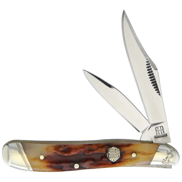 This Peanut by Rough Rider features 440A stainless steel blades with brown stag bone handles. It has mirror finished clip and pen blades and a closed length of 2.88″.